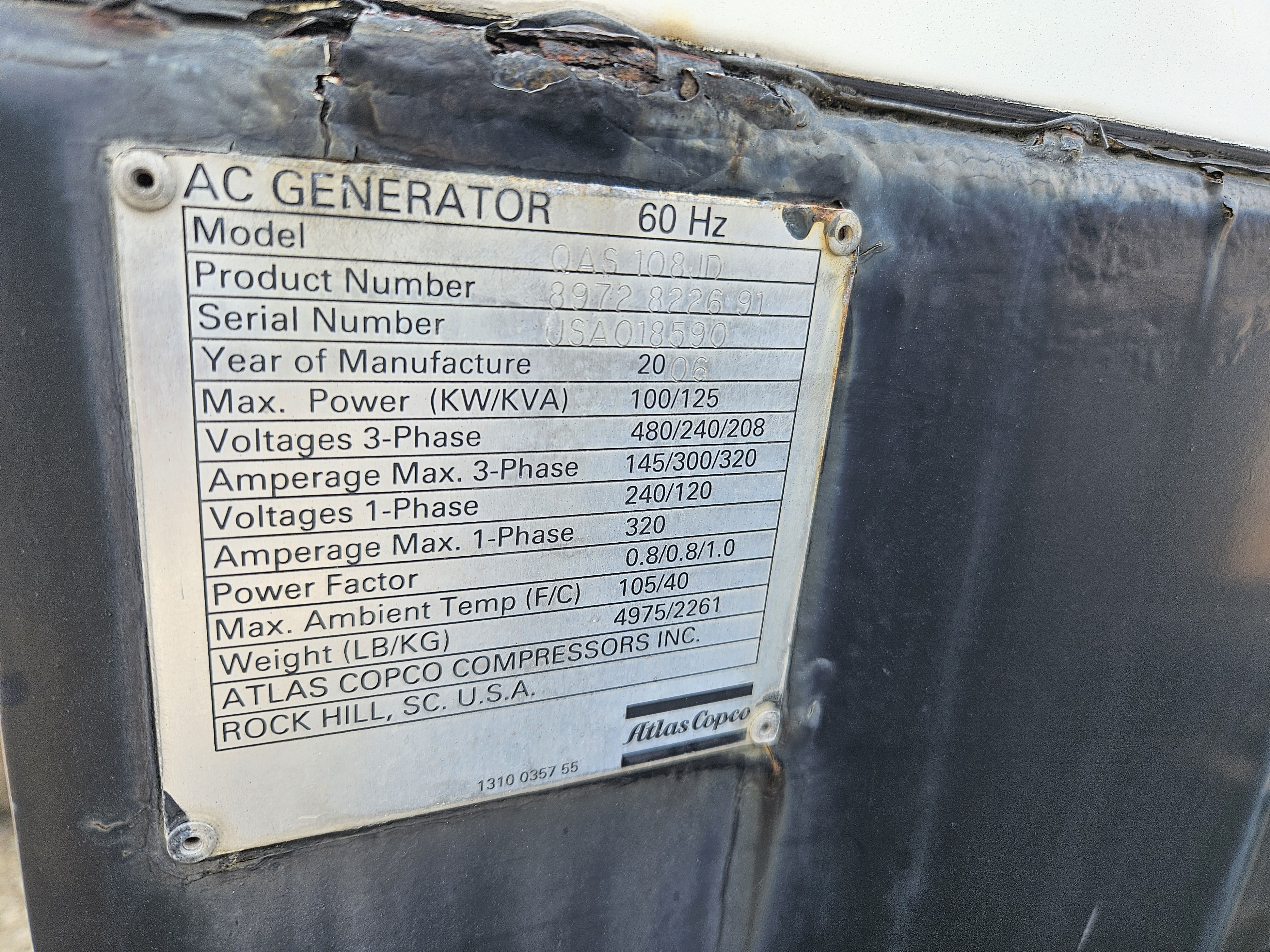 John Deere 6068TF250 Engine with Electric Starter. This Atlas Copco QAS108JD (100 kW Generator) is for sale and backed by our 30 day warranty. Contact our industrial generator experts with your questions.