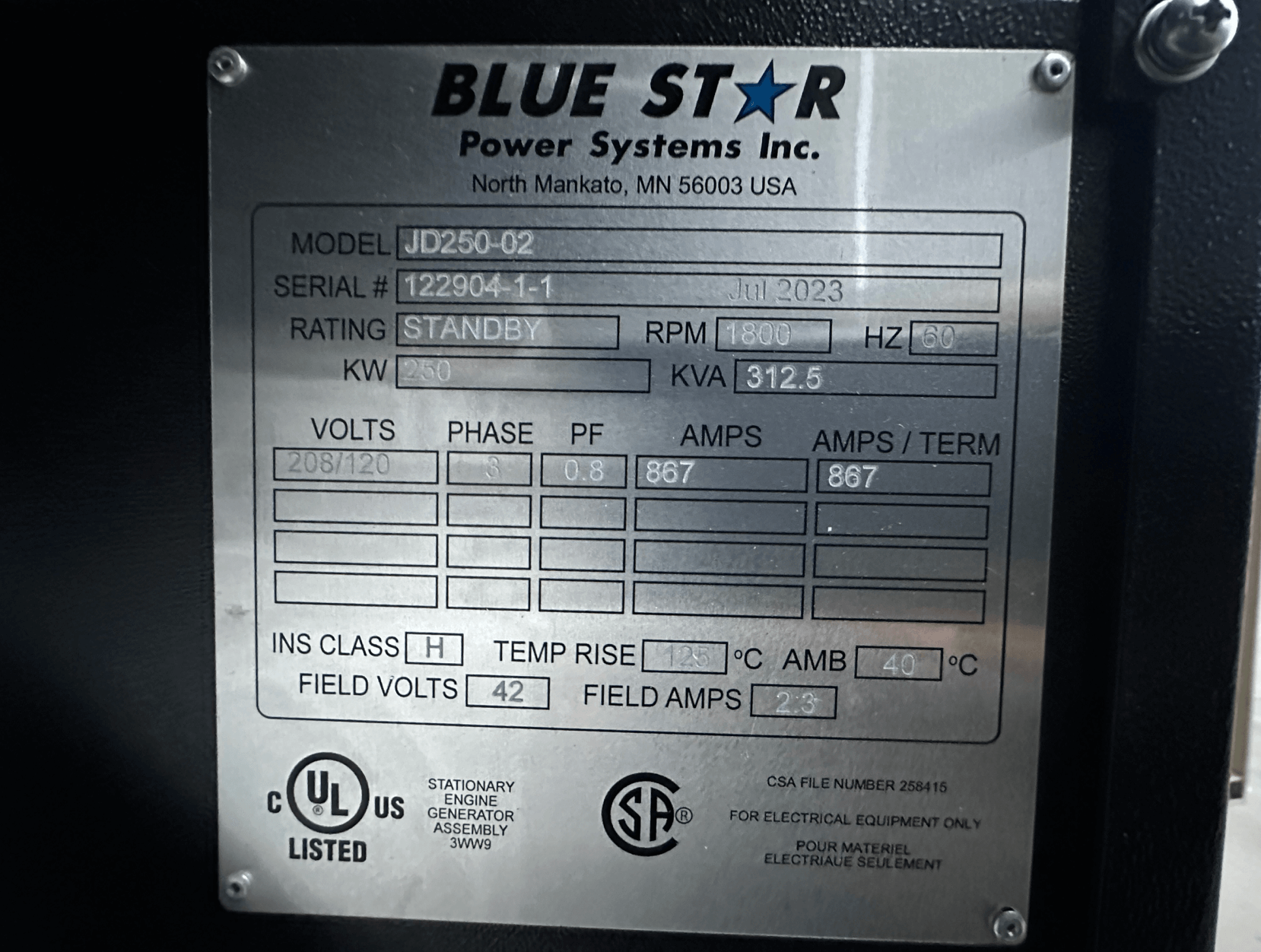 250 kW Standby / 225 kW Prime