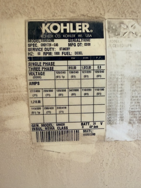 Kohler 800REOZMB Standby Diesel Generator