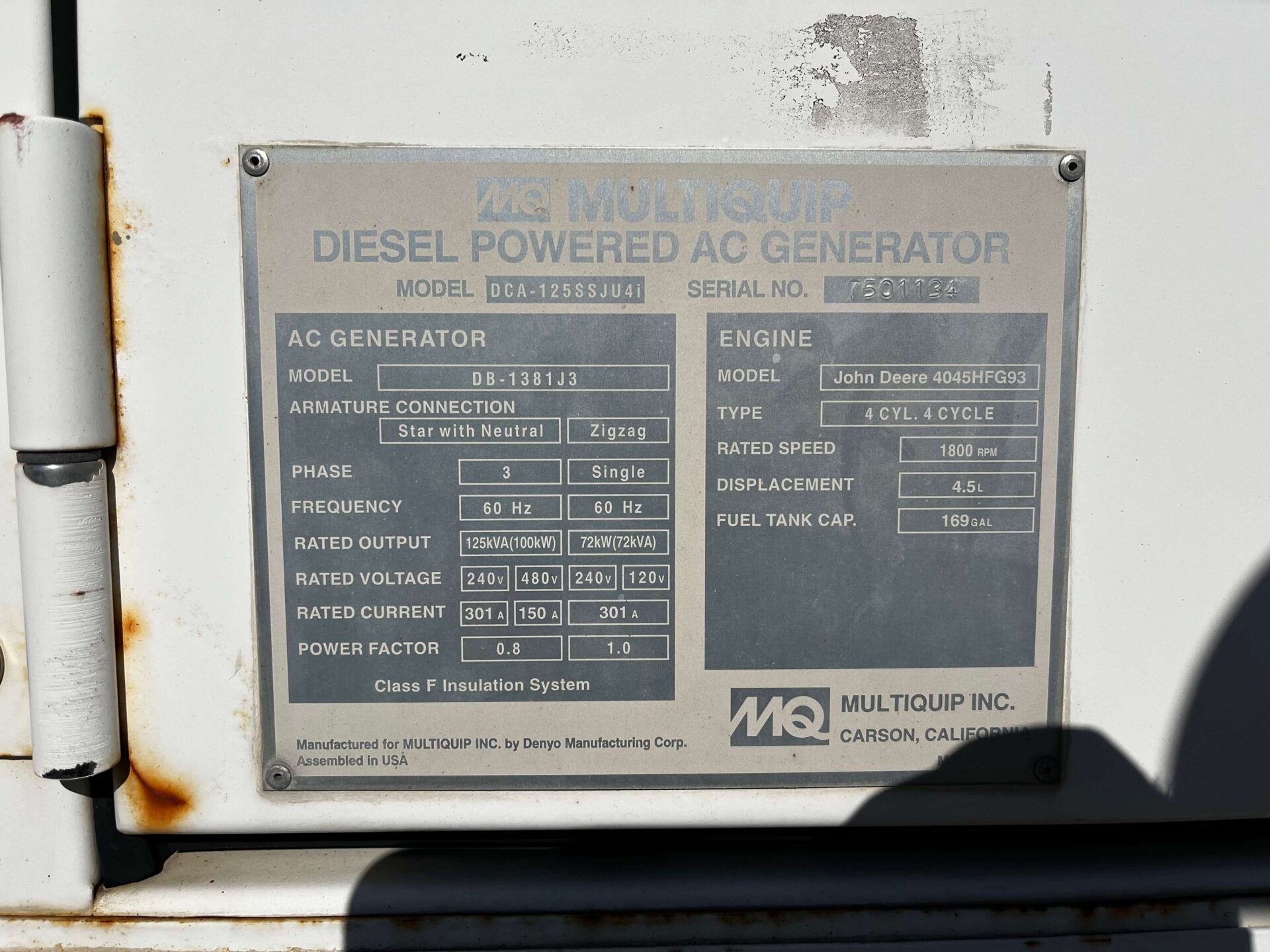 John Deere 4045HFG93A Engine with Electric Starter. This Multiquip DCA-125SSJU4i (110 kW Generator) is for sale and backed by our 30 day warranty. Contact our industrial generator experts with your questions.