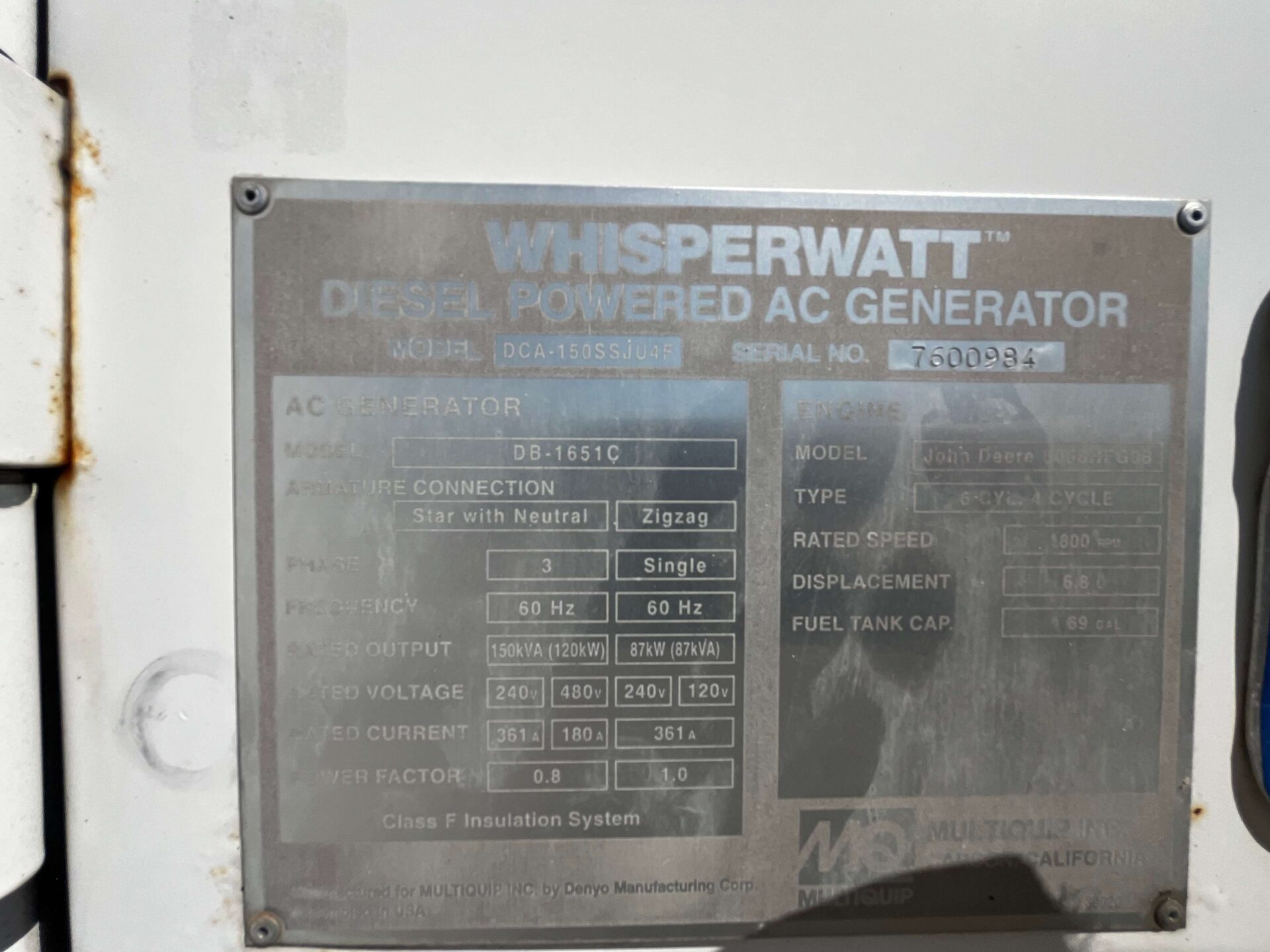 John Deere 6068HFG08 Engine with Electric Starter. This Multiquip DCA150SSJU4F (132 kW Generator) is for sale and backed by our 30 day warranty. Contact our industrial generator experts with your questions.